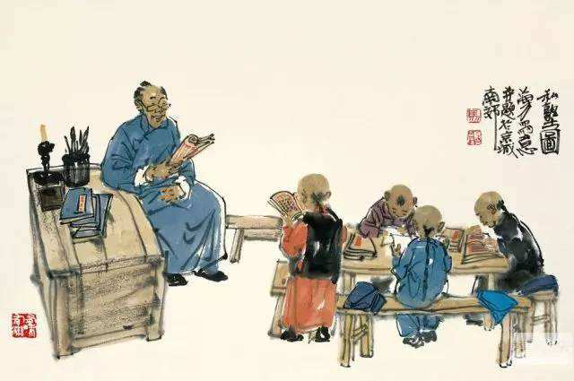 “读”是朗读。学生先把课本送到老师面前“上书”。古代没标点,老师用烧烤签子一般粗的“点书签”蘸印泥,在书中断句处点个红点,点书签一头大一头小,小点是逗号,大点是句号—这叫“点书”。